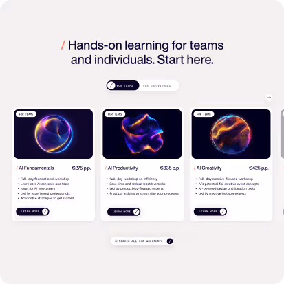 The Startup Website sprint was built in Webflow. The site needed to hold multiple product types, workshops, modules, and agents, and speak to different audience segments without losing a clear message on first contact. We structured the information architecture around those three offer types, with each section designed to make the value obvious quickly.