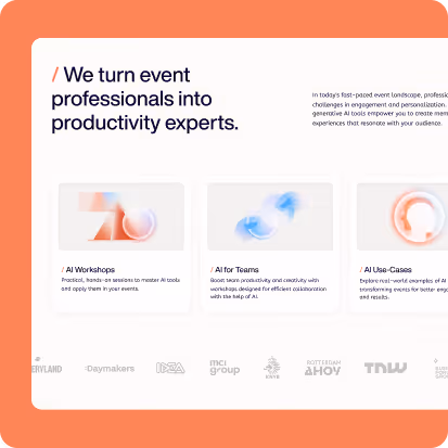 A post-launch sprint expanded the site as the product expanded. New pages for AI Agents, showcasing the automations Narrative builds for event clients. AI Modules for their modular training format. A Library of Tools for event professionals. A Clients overview with category-based logo navigation across agencies, organizers, venues, suppliers, and institutions. As Narrative added product lines, the website added pages, same system, no rebuild required.